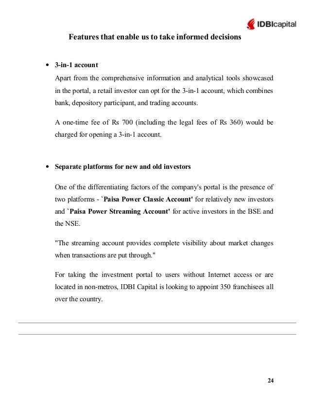 Idbi Paisabuilder Online Stock Share Trading Bse And Nse Stocks Derivatives Futures Options Ipos Mutual Funds Ncds Bonds Online - Idbi online demat account is available for all those who want to take part in the stock market of the country.